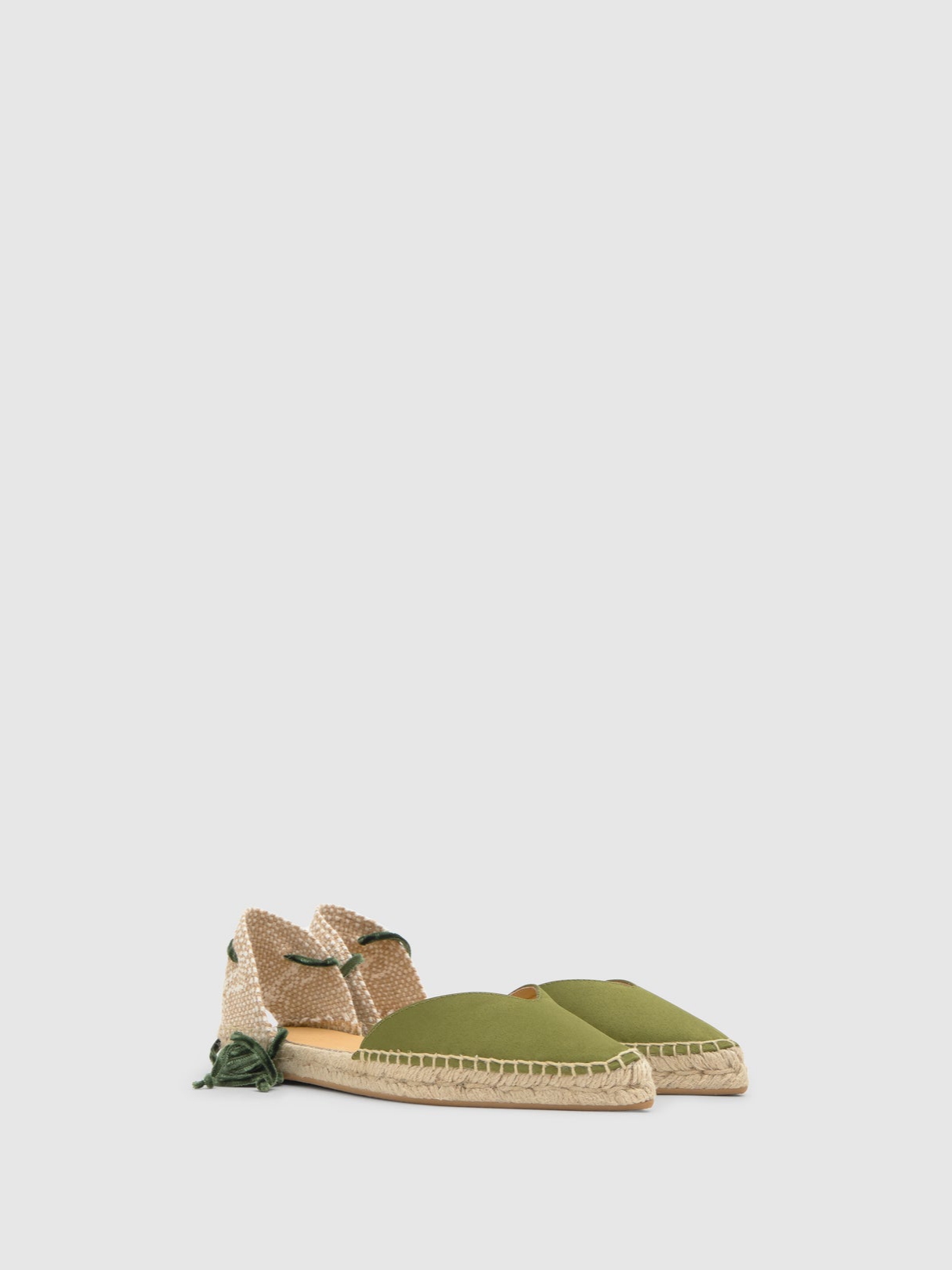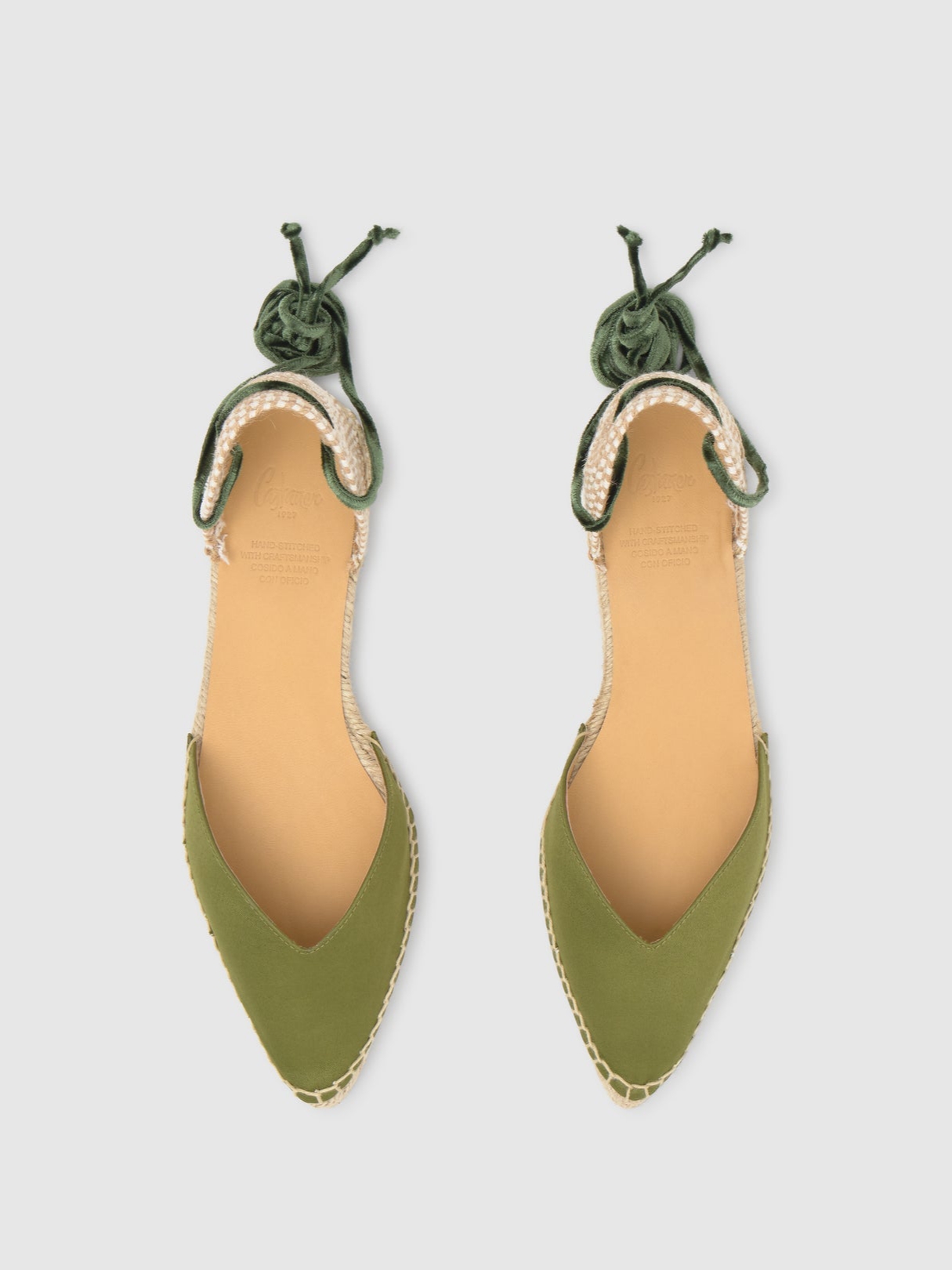 Flat εσπαντρίγες Castaner με σατέν υφή και βελούδινο δέσιμο. Έντονο V και μυτερή μύτη. Χειροποίητη σόλα απο γιούτα.