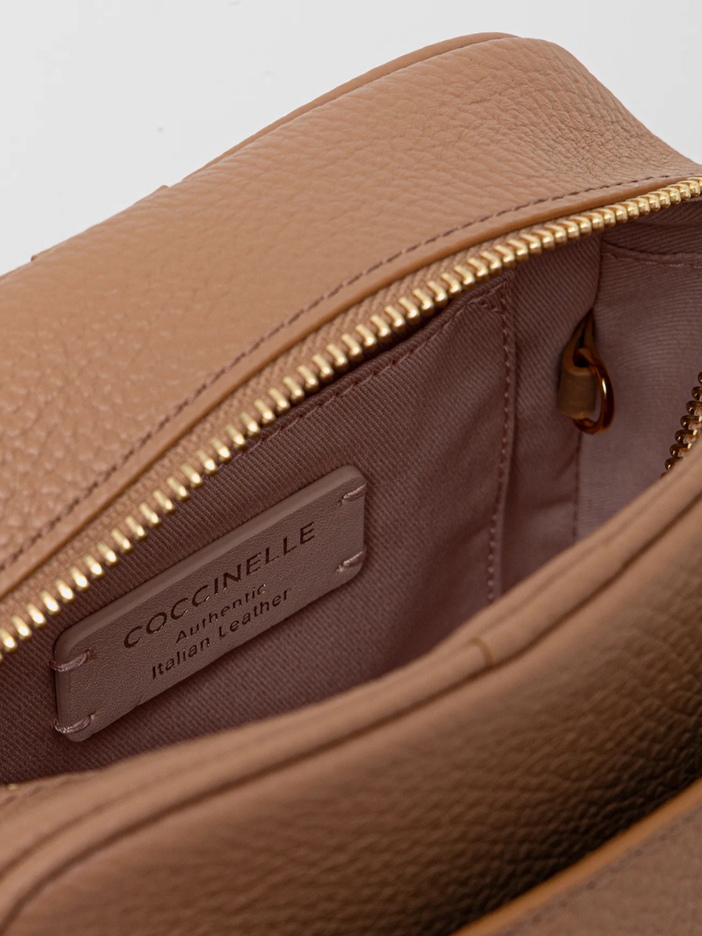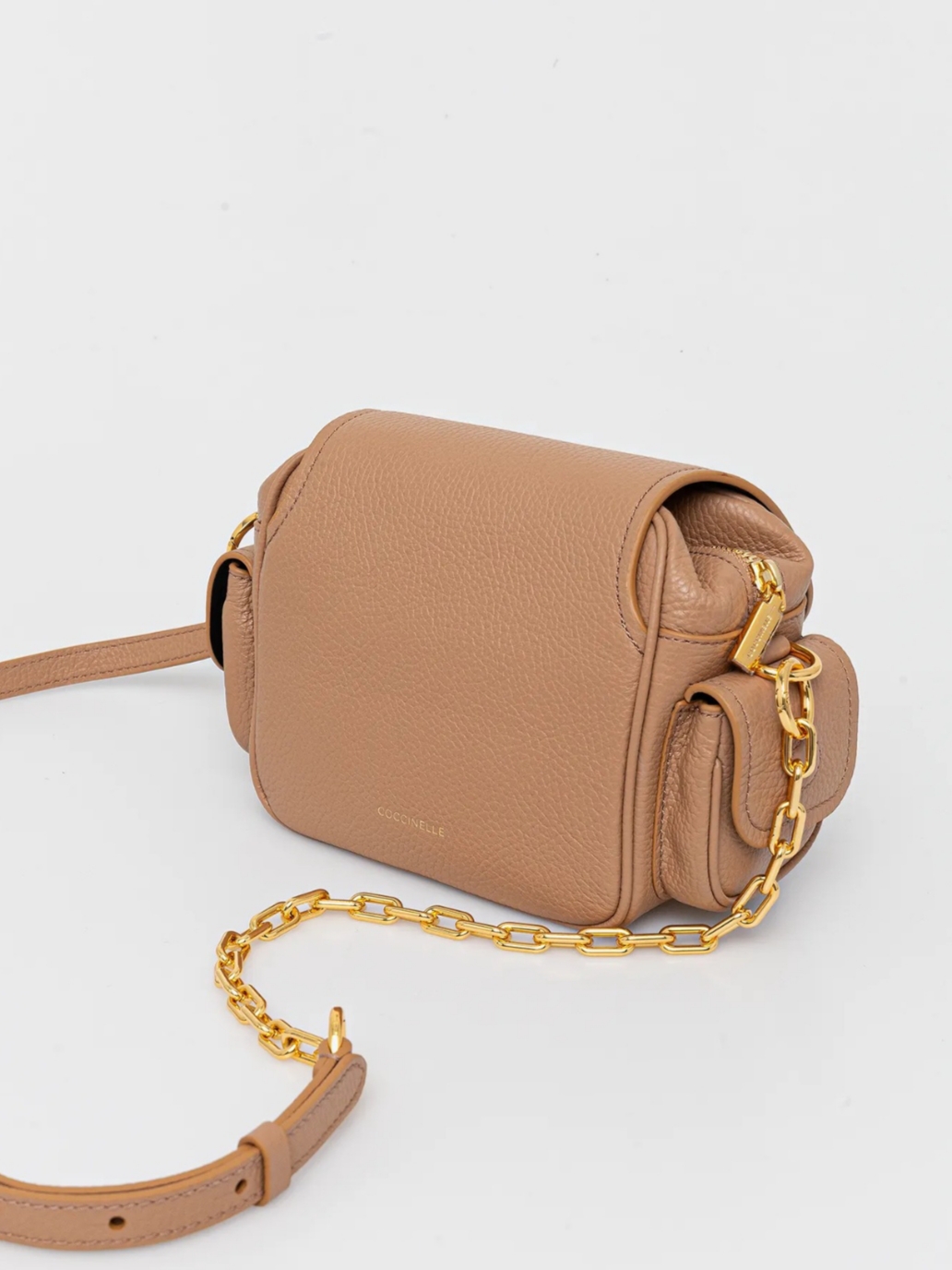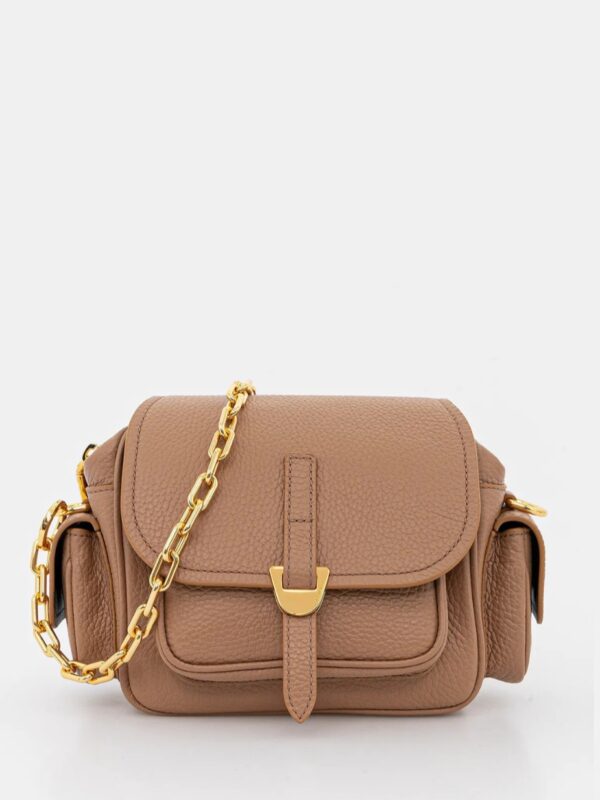 Τσάντα δερμάτινη Coccinelle με αποσπώμενο λουρί. Μια κεντρική θήκη με καπάκι και φερμουάρ και εσωτερικό τσεπάκι. Εξωτερική τσέπη με καπάκι-μαγνήτη στο μπροστινό μέρος. Μικρά τσεπάκια με καπάκι-μαγνήτη αριστερά και δεξιά. Μεταλλικά στοιχεία σε χρυσή απόχρωση.