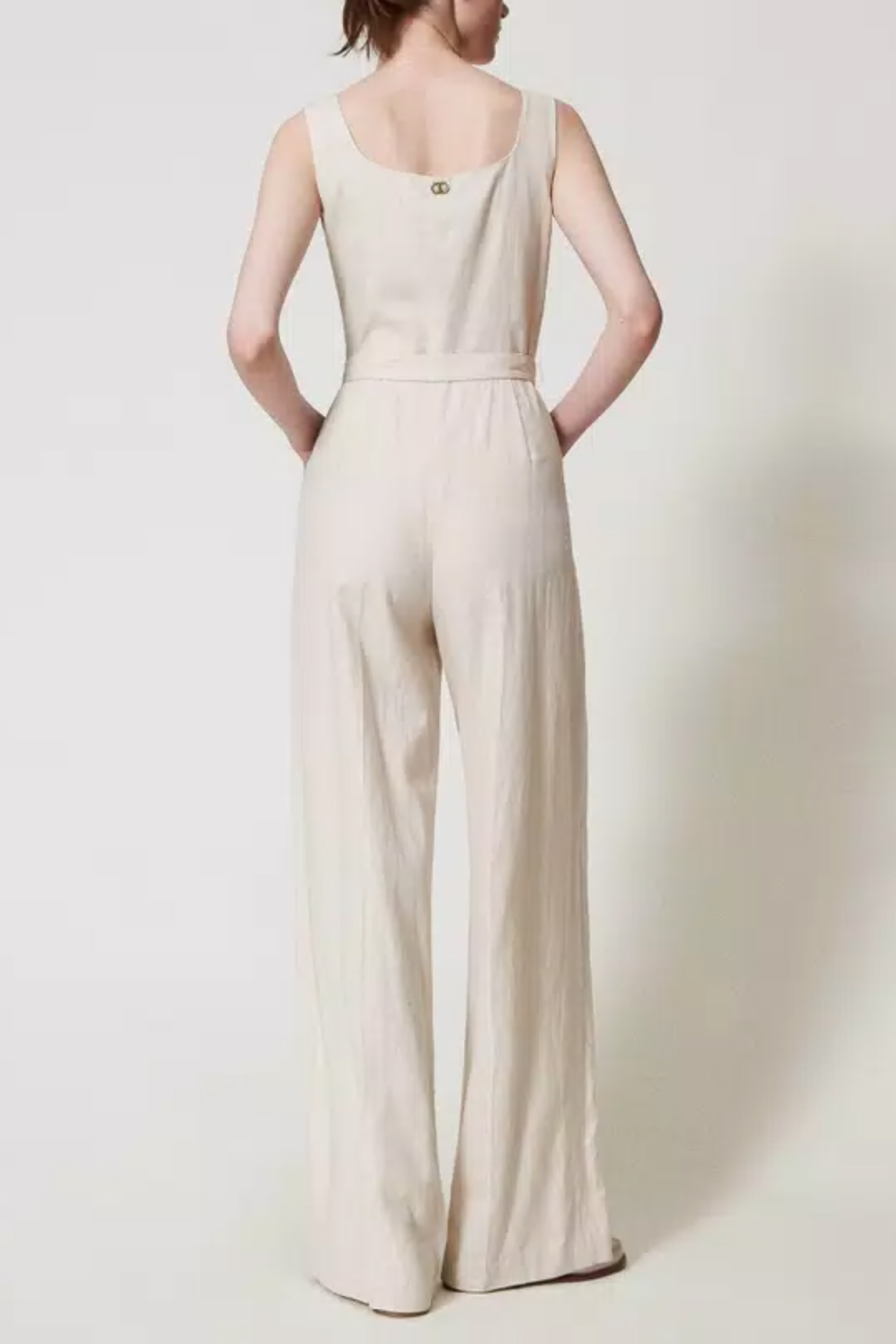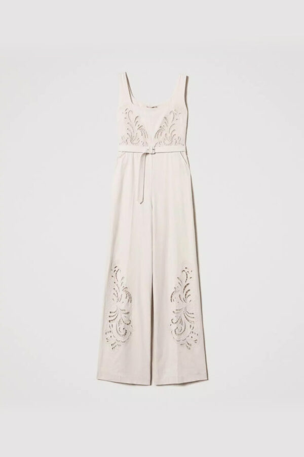Ολόσωμη φόρμα Twinset από λινό ύφασμα με σχέδιο από κοφτό κέντημα και τσέπες στα πλαϊνά. Διαθέτει επένδυση φόδρας στο πάνω μέρος και ανεξάρτητη ζώνη με υφασμάτινη αγκράφα. Κούμπωμα με κρυφό φερμουάρ στο πλάι.