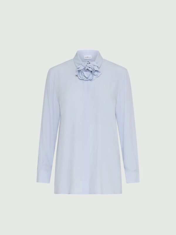 Πουκάμισο Marella crepe de Chine με μείγμα μεταξιού. Με γιακά και διακοσμητικό λουλούδι απο το ίδιο ύφασμα, καλυμμένο κούμπωμα και μακρυά μανίκια. Κανονική εφαρμογή.