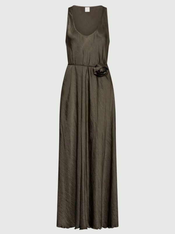Φόρεμα Marella αμάνικο με σατινέ σαγρέ υφή. Στρογγυλή λαιμόκοψη και ασύμμετρο τελείωμα. Ζώνη με λουλούδι απο το ίδιο ύφασμα.