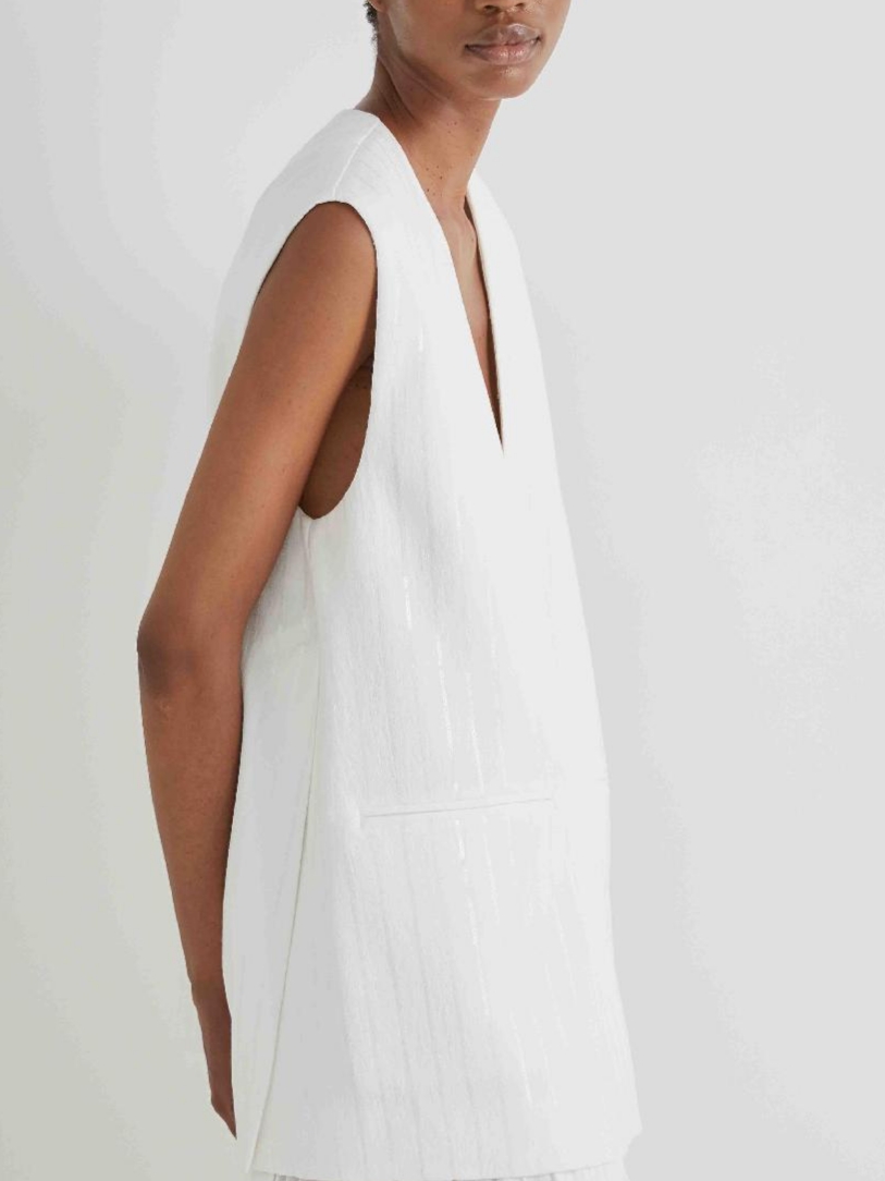 Μακρύ γιλέκο MEIMEIJ σε oversized γραμμή, με ανοίγματα στα πλάϊνά. Χωρίς πέτο και χωρίς κούμπωμα. Διακοσμητική διάφανη παγιέτα σε κάθετες ρίγες.