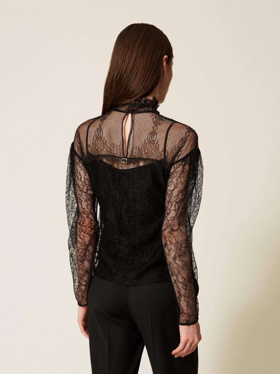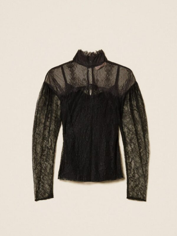 Δαντελένια μπλούζα Twinset με lingerie τιραντέ, με μακρύ φαρδύ μανίκι με φουσκωτό ωμάκι. Ψηλός γιακάς με δαντελένιο τελείωμα. Οριζόντια ραφή στο στήθος και στην πλάτη. Άνοιγμα απο τον αυχένα με κουμπί. Μεταλλικό λογότυπο στην πλάτη.