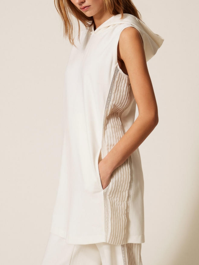 Κοντό φόρεμα Twinset με κεντημένο λογότυπο στο κάτω μέρος, crepe de Chine με δαντέλα πλισέ στα πλαϊνά. Έχει κουκούλα και η εφαρμογή είναι άνετη.