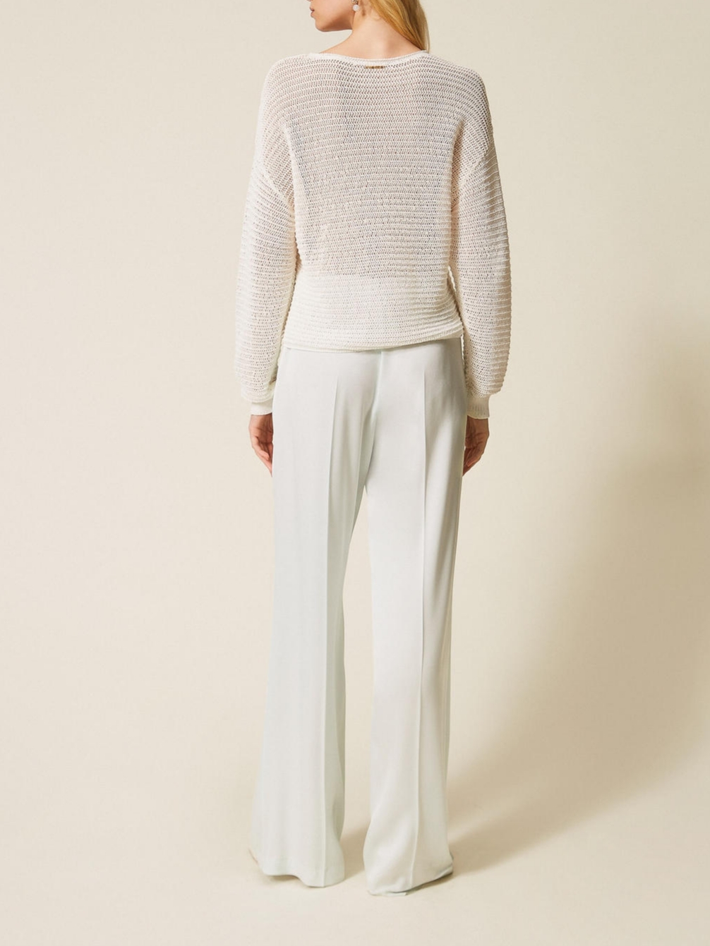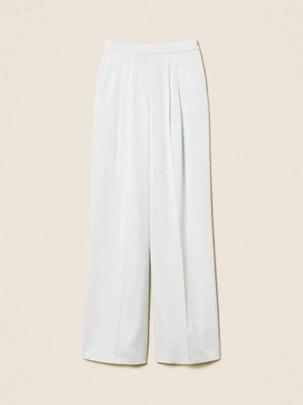 Σατέν παντελόνι Twinset με πιέτες μπροστά, κλείσιμο στο πλάι με φερμουάρ, λάστιχο πίσω στη μέση και λοξές τσέπες. Φαρδιά εφαρμογή.