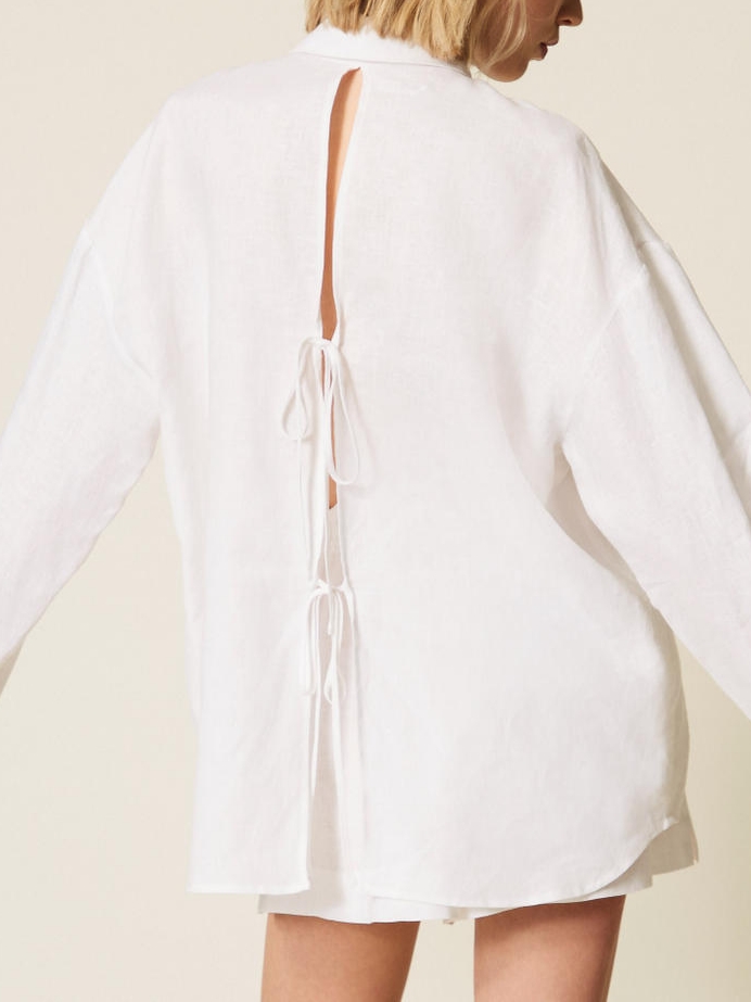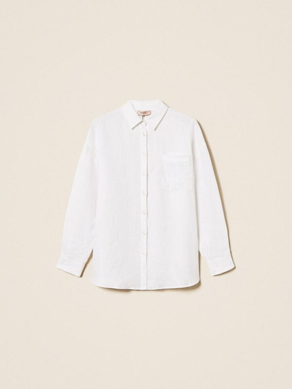 Πουκάμισο Twinset από καθαρό λινό με κέντημα στην τσέπη στο στήθος στην ίδια απόχρωση. Κλείσιμο με κουμπιά, μακριά μανίκια με μανσέτες και άνοιγμα στην πλάτη που δένει με κορδόνια.